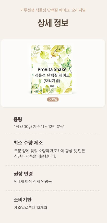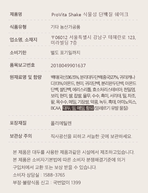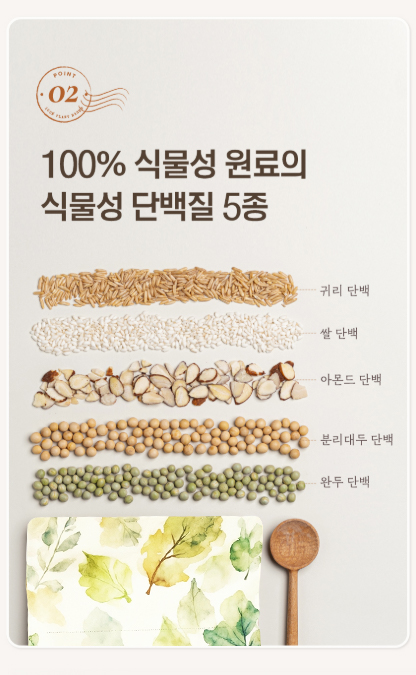 | 성분 | 식물성 단백질 5종 | 두유 분말 | 귀리 분말 | BCAA | 아미노산 9종 |